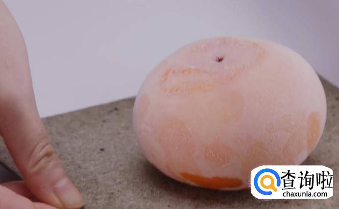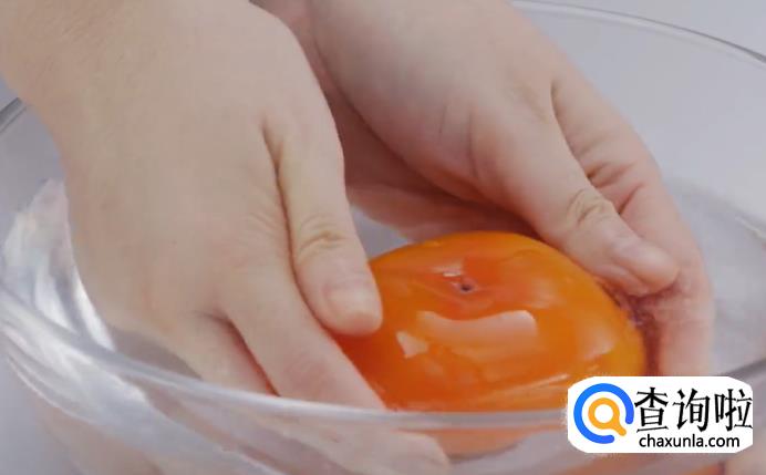 冷冻完成后取出来,浸泡在温水中,再剥去柿子的表皮。