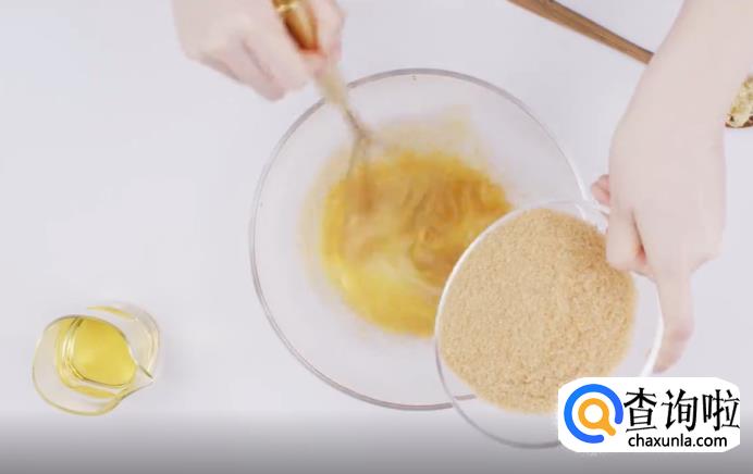 打2个鸡蛋,用筷子搅拌均匀,再加入黄糖、植物油和姜茸,混合搅拌。
