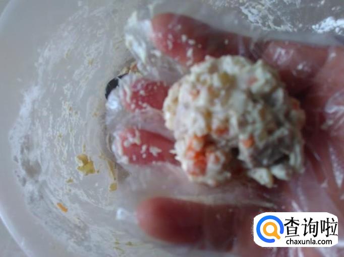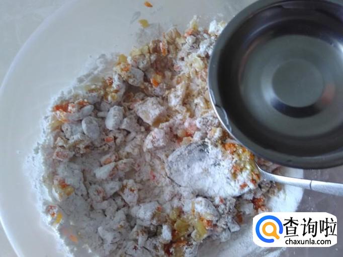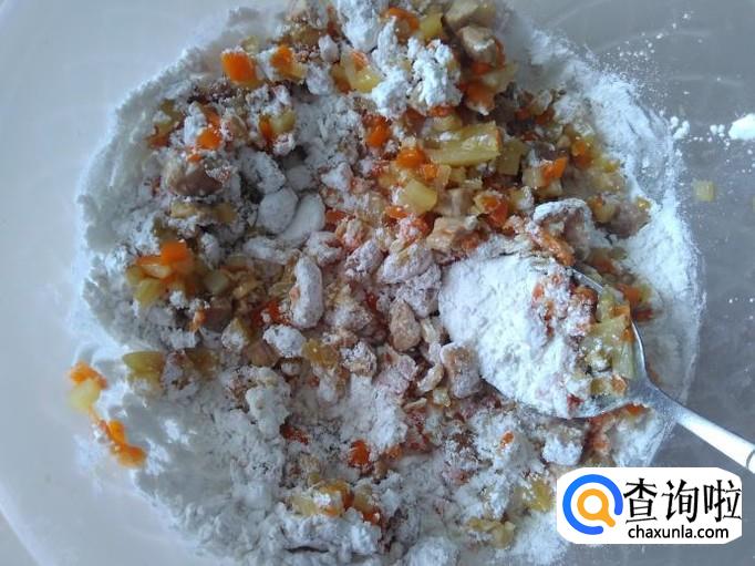 把200克糯米粉放到盘中,然后把过油盐的三丁铲上盘子混合。