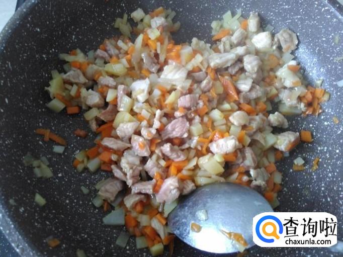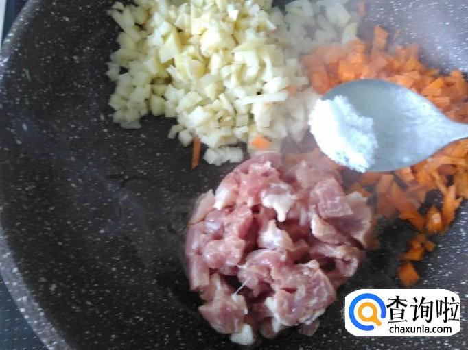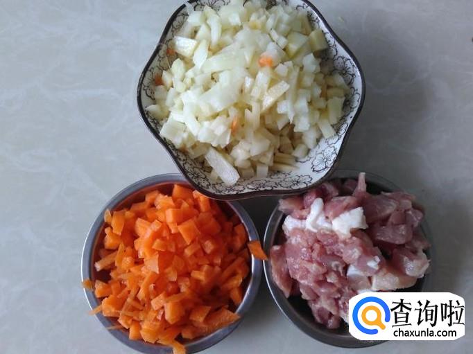 把红萝卜、莲藕去皮切成小丁,瘦肉也切成小丁备用。