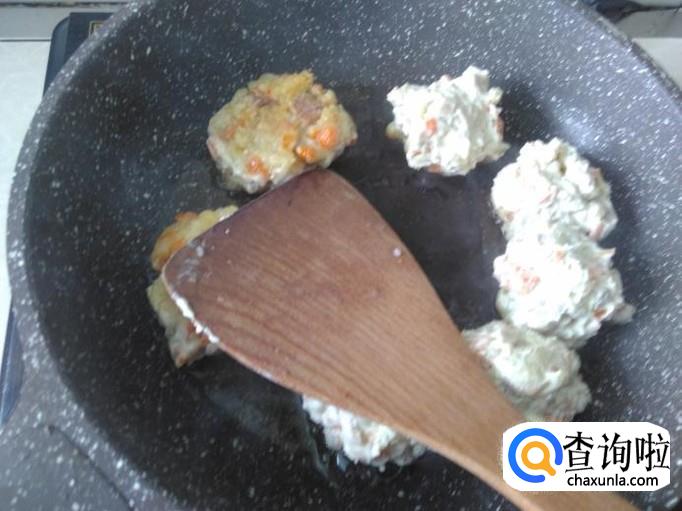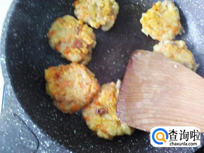 煎3分钟左右把丸子翻转,然后用锅铲把丸子压成小饼状。