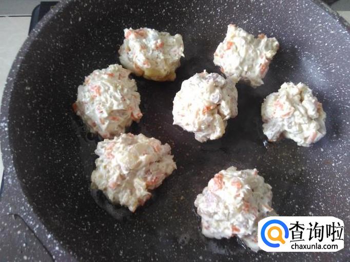 然后用手抓揉成一个个小丸子,开火下油,把丸子放进去用小火煎。