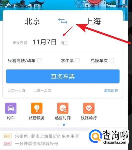 打开12306APP,先选择起点和重点,还有出发时间,选择查询车票。