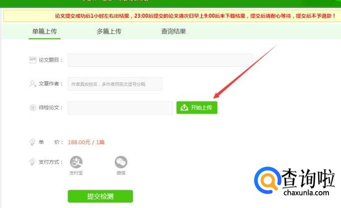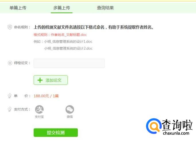 有单篇上传,写出论文题目、文章作者,然后上传一篇论文,单价是188一篇,当然学校一般会提供一次免费的查重机会;