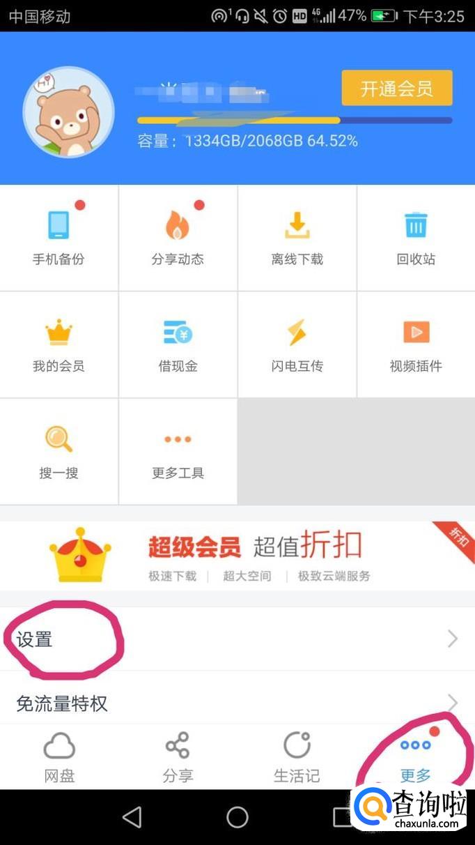 打开手机百度网盘,点击更多下的设置按钮,如图。