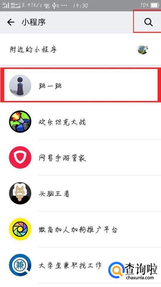 若在小程序界面有跳一跳直接进入即可,倘若没有点击右上角,搜索跳一跳,如图所示