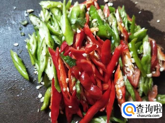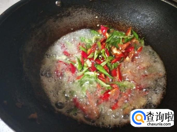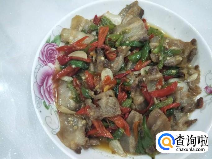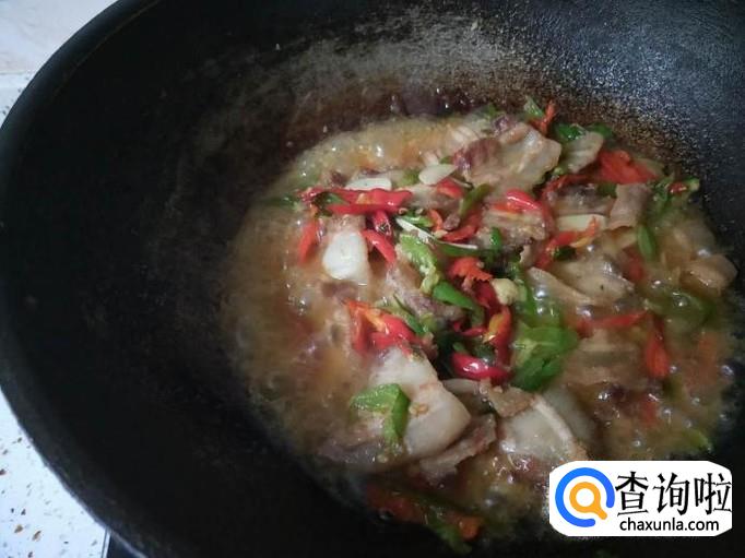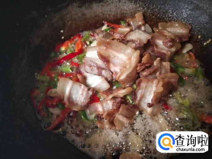 辣椒炒断生之后,即可把刚刚煎好的五花肉放在锅里跟辣椒一起翻炒,然后适当加点水和食盐调味。