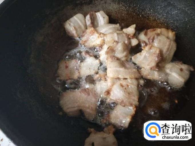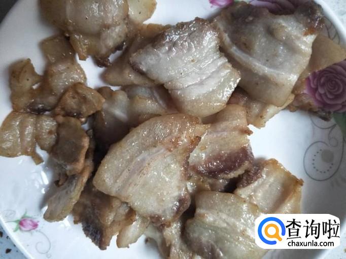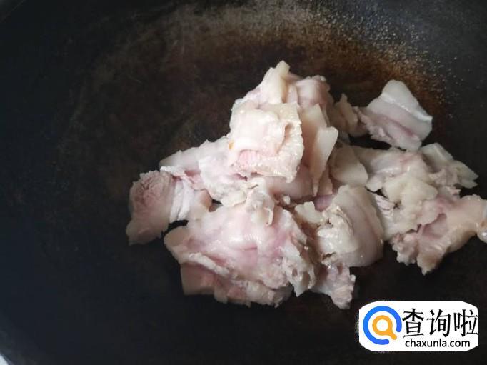 把切好的五花肉直接放在锅里,不需要加油,选择用中火慢慢煎就行,等到肥肉里面的油出来以后,就能盛出来放在盘子里面备用。