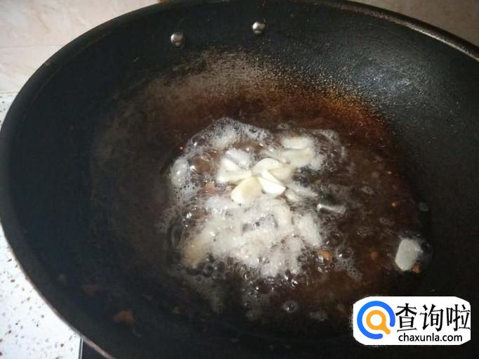 五花肉盛出来以后,直接用肥肉煎出来的油放入大蒜即可,要是油比较多的话可以适当盛出来点,炒青菜还是非常好吃的,大蒜爆香之后就能加入青椒和红椒。