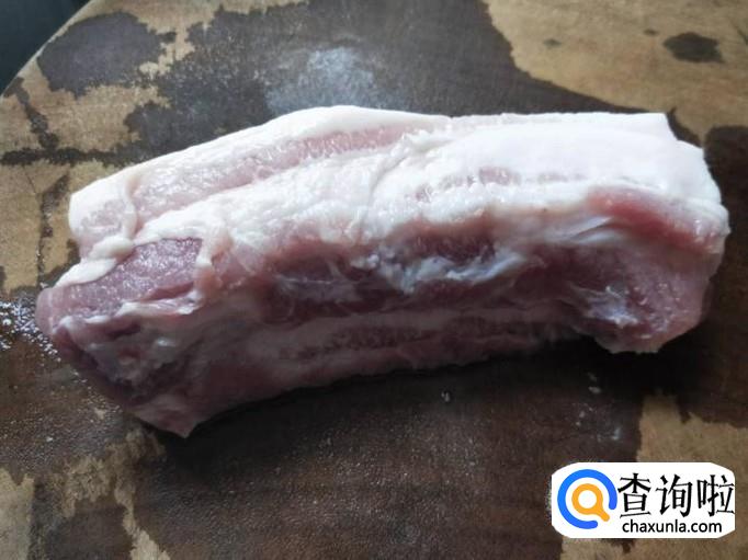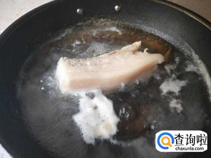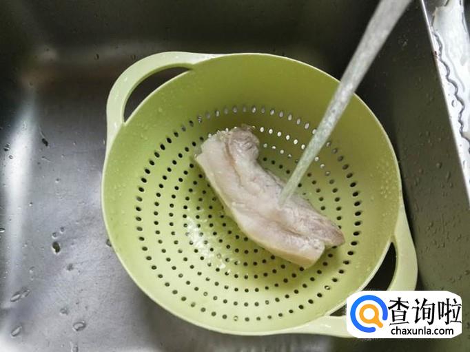 等到水煮沸之后,就能把五花肉倒出来放在篮子里面,加上清水冲洗干净,然后再切成一片一片的,最好切薄点,不要太厚了。