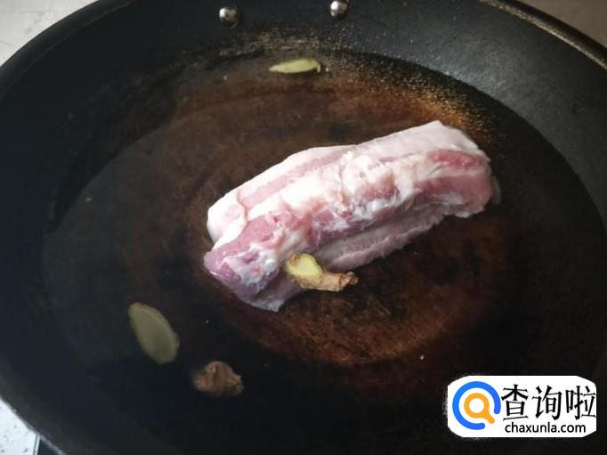 买回来的五花肉用清水冲洗干净,接下来锅里放水加入五花肉,然后加上姜片和料酒去腥味。
