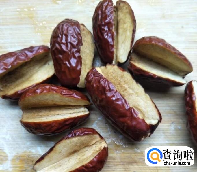 然后我们把大枣用刀先直刀切一下,再斜刀切一下,把枣核取出备用