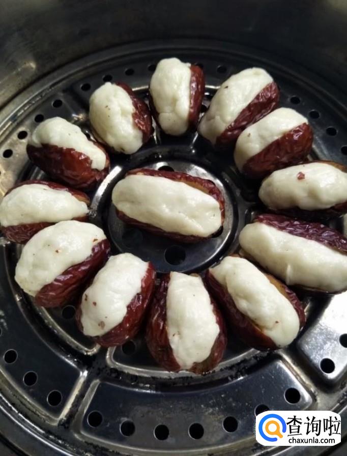 然后我们把小面块塞入大枣中,摆入蒸锅中(蒸锅的篦子上刷一层食用油),蒸15分钟