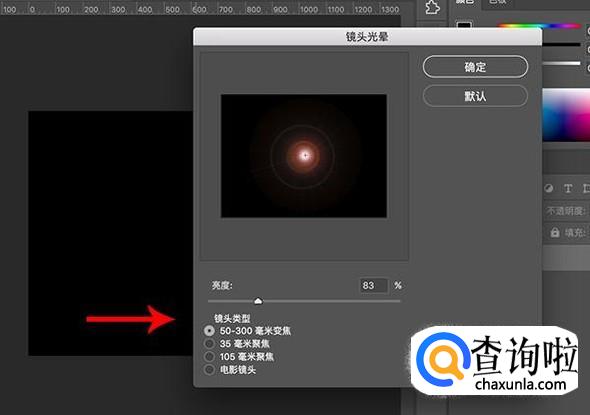 在镜头光晕设置界面,将中心点喝光晕进行重合,镜头类型选择为“50-300mm变焦”