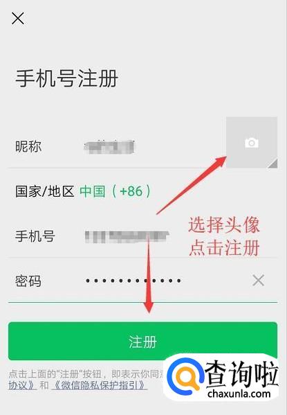 填写好信息以后点击右侧的照相机按钮添加头像,接着点击注册按钮,如下所示