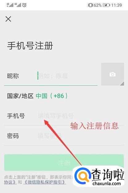然后就进入注册信息填写界面,在这里填写昵称,手机号以及密码,如下图所示
