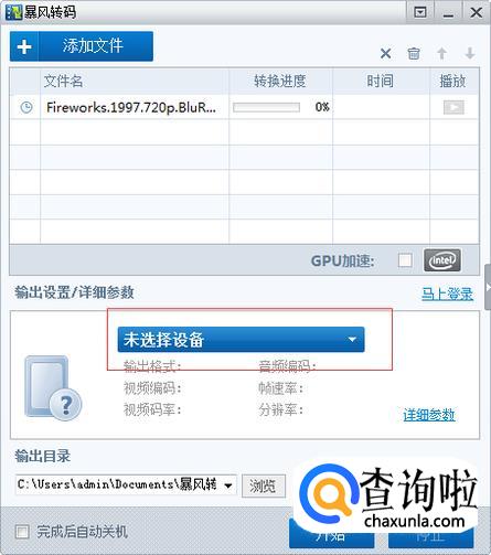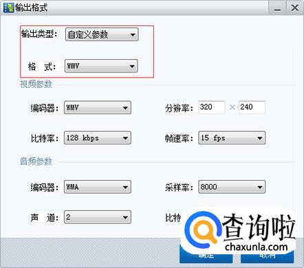 点击“未选择设备”,选择“输出类型”,可以选择“自定义参数”,并选择要转换的格式,如“wmv”格式,然后点“确定”。