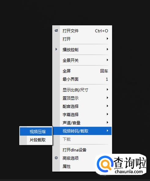 在播放的视频上单击鼠标右键,单击“视频转码/截取”,选择“视频压缩”。