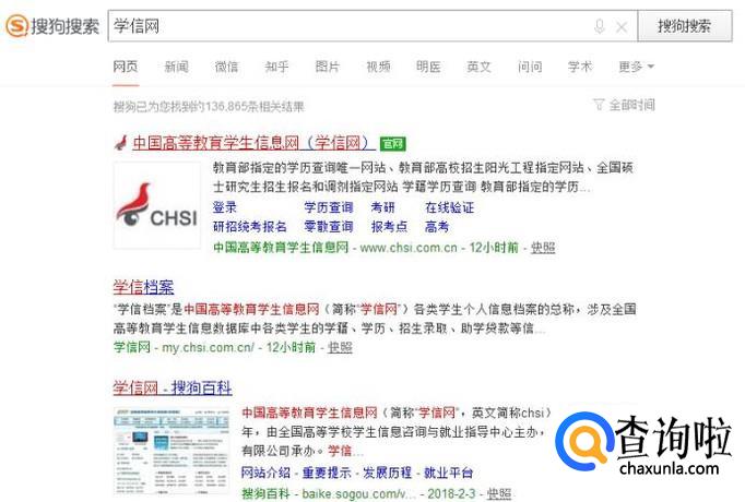 首先我们先使用搜狗浏览器搜索学信网 ,然后点击中国高等教育学生信息网官网,进入学信网。