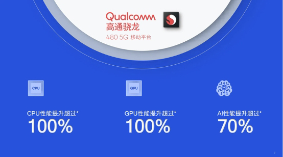 骁龙480,是2021年1月4日高通发布新款骁龙4系5G平台。骁龙480集成了高通Kryo460 CPU和Adreno 619 GPU,最高主频可达2.0GHz,CPU和GPU均实现了100%的提升,AI性能提升70%。同时,骁龙480还是高通第二款支持三ISP的处理器,通过集成的QualcommSpectra345ISP,能够实现1080p 60FPS或720p 120FPS视频拍摄。