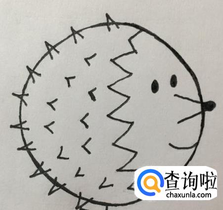 画一个大圆,然后画出眼睛、鼻子、嘴巴。画一根曲折的分界线,线的另外一边画满刺猬的刺。