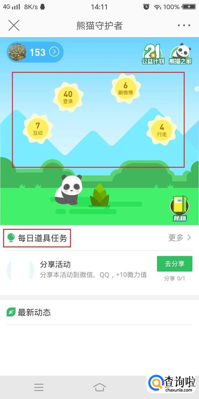进入熊猫守护者首页后,即可点击已经生成的微力值,然后点击“每日道具任务”来获得额外的微力值,如图所示