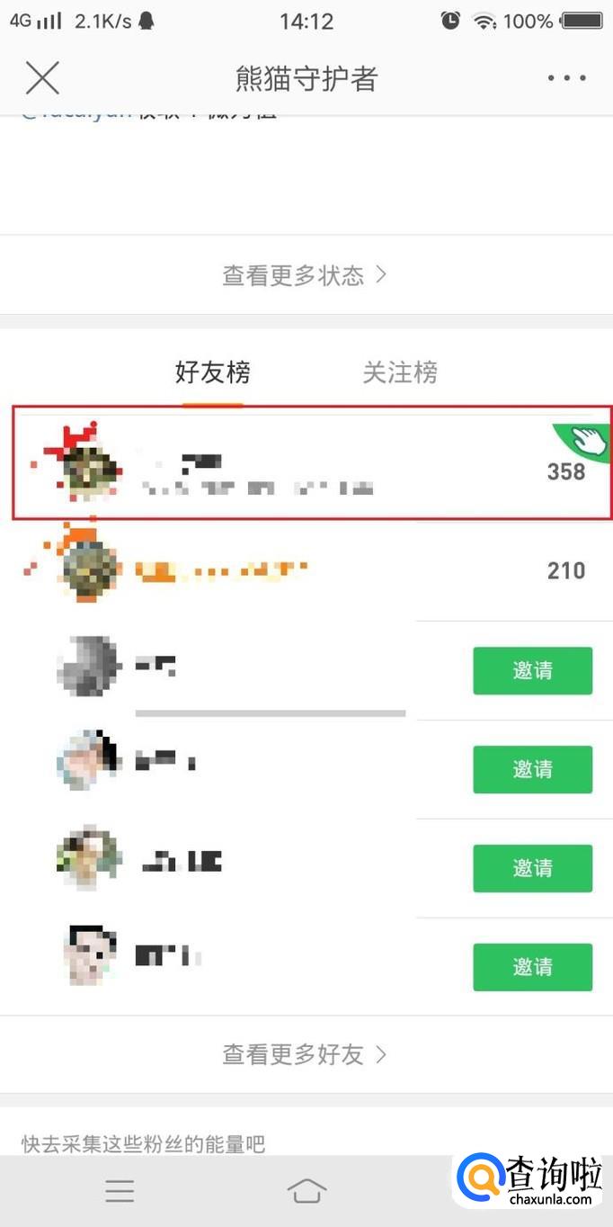处了上述方式可以获得微力值意外,还可以通过“偷取”好友的微力值来获取,在熊猫守护者首页,下滑菜单找到好友榜,在好友列表中右侧有“手”的标志的,就可以偷取微力值,如图所示