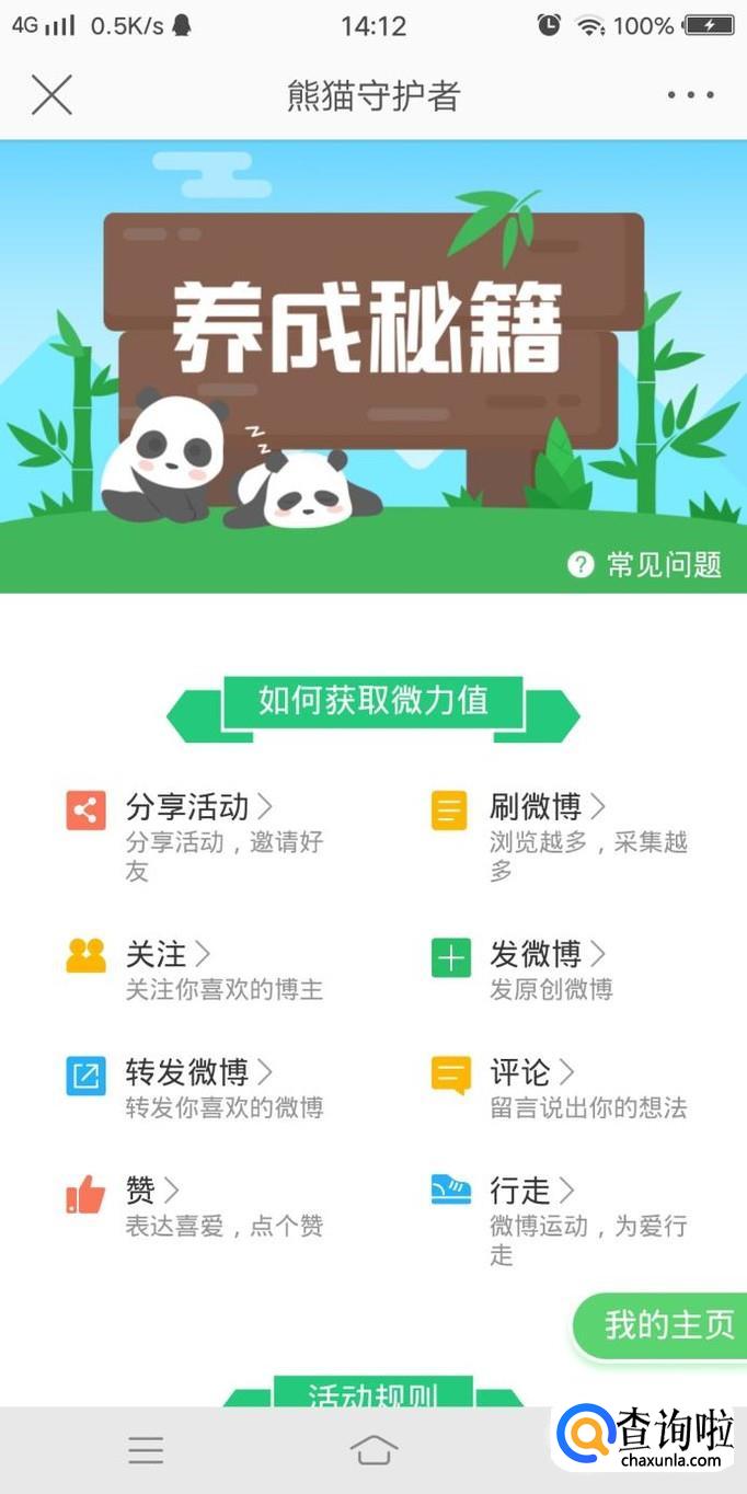 熊猫守护者活动规则:所有任务在24小时候,才能产生微力值;未及时收取的微力值48小时后消失;每天只能给同一个好友浇水3次;采集好友微力值,每个微力值只能采集一次;微力值达到10000时,即可以在熊猫食源地种一株竹子