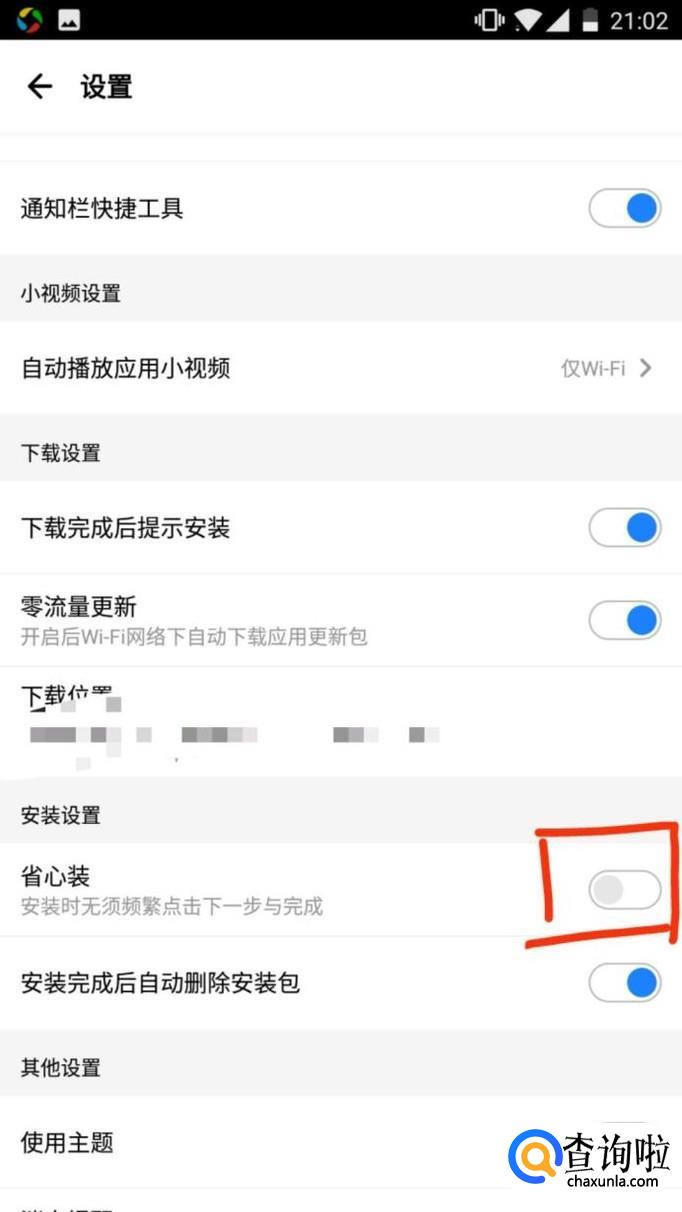 在设置界面里,滑动到下方,找到“省心装”,点击开启,即软件下载完之后,会自动快速安装
