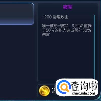 破军这件装备的话,可以说大大的提高公司离到物理攻击,同时这件装备的被动技能也是非常可怕的,能让鲁班对血量少于一半的敌人造成30%的额外物理伤害。所以要求完公司里玩鲁班的玩家,团战的时候尽量把自己的输出交给对方的脆皮或者是血量比较少的英雄,这样效果会更好。