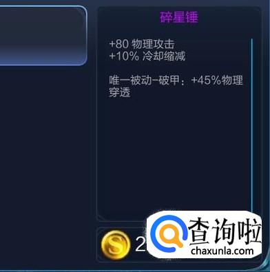 碎星锤这件装备的话,能够提高鲁班的物理攻击的同时,还能够减少鲁班的技能cd。这件装备还有一个很好的地方就是它能够把鲁班的物理穿透能力提高到最高。对于对方的肉比较多的情况下,出一把破甲弓,效益是非常高的可以无视敌方肉的防御