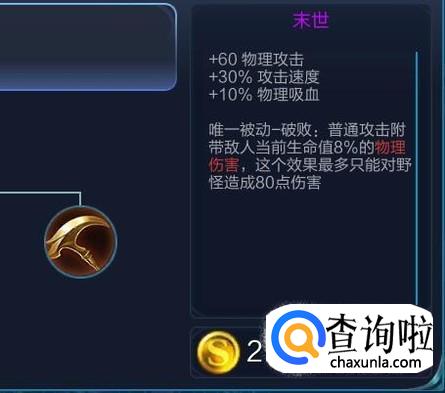 末世这件装备不仅可以提高鲁班的物理攻击,还能够提高他的攻击速度和物理吸血。与此同时,还能够还能够对敌方英雄造成额外的物理伤害。是非常好的一件攻击装备,大家可以优先考虑出它。