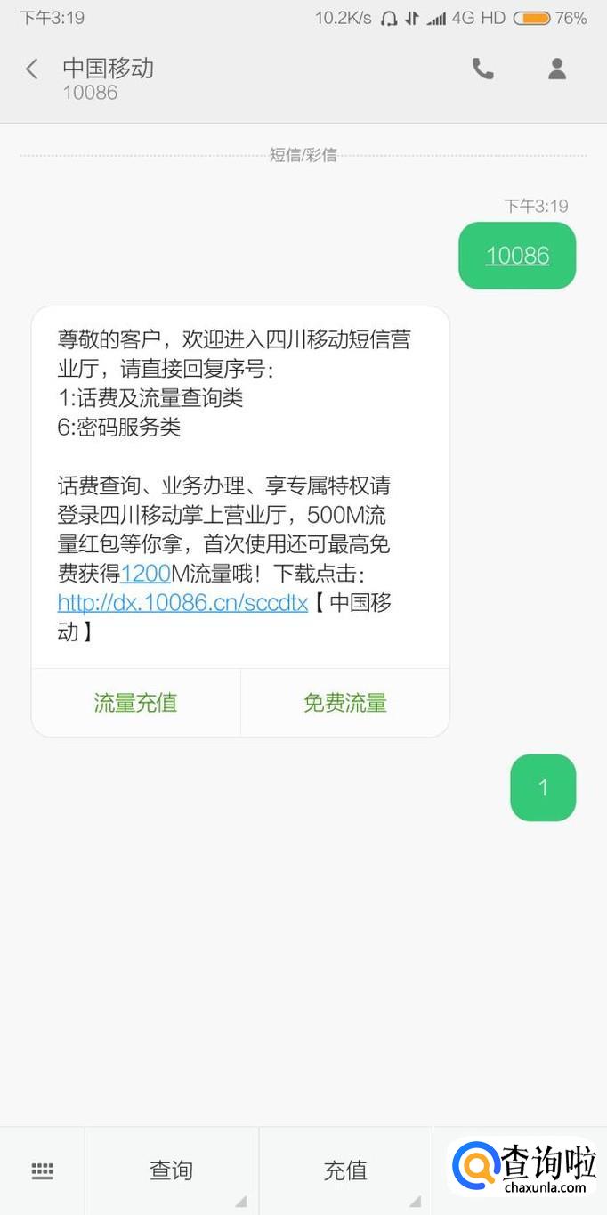 第四种方法是编辑短信内容“10086”发送到10086,进入中国移动的短信营业厅,根据短信内容提示来办理流量套餐。不同省份的10086短信菜单略有差异。