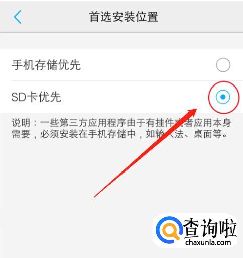进入到“首选安装位置”界面,勾选下方的SD卡优先选项。