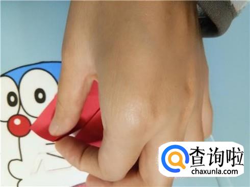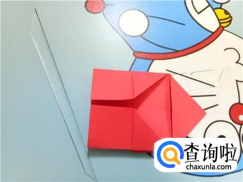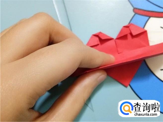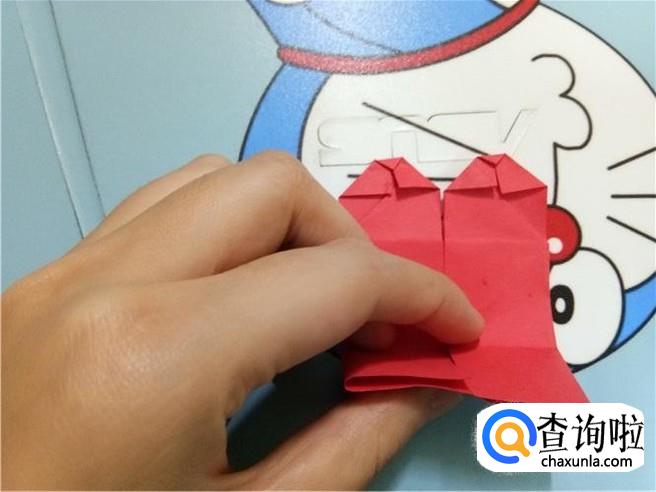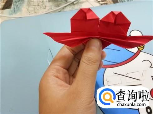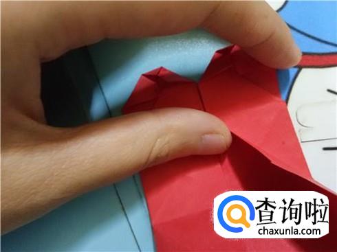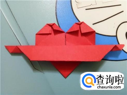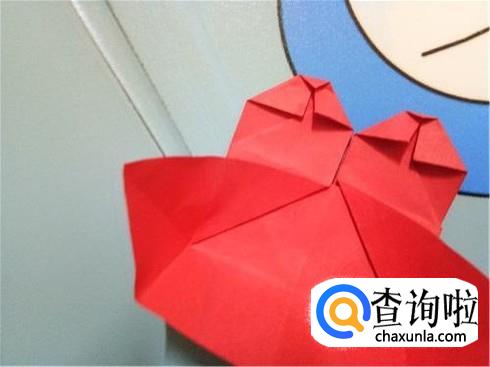 最后,将折的后面的两次的凸出部分轻轻的向下拉一点,但是它们的对称点仍然在三次折叠的对称点。翻到另一面后就可以看见一个带“翅膀”的爱心了。