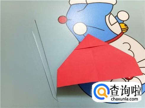 顺势将下方最宽的部分折上去,与刚才折上去的边重合,在后面剩下的这一部分中我们将它来回的折三次,就会形成后面的“翅膀”。