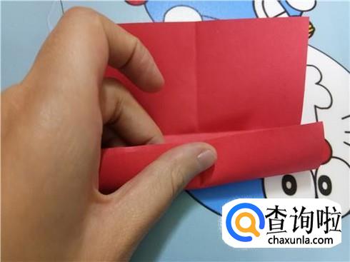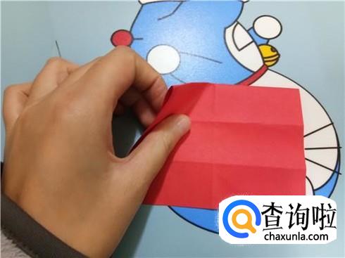 再翻过来就会有一个小的三角形,将两边凸出来的部分沿着中轴线折一下再放回刚才的位置,以小三角形的最长边为基准,将另一部分折过来并且在折过来时要将四分之一的折纸沿着之前中轴线折过来。
