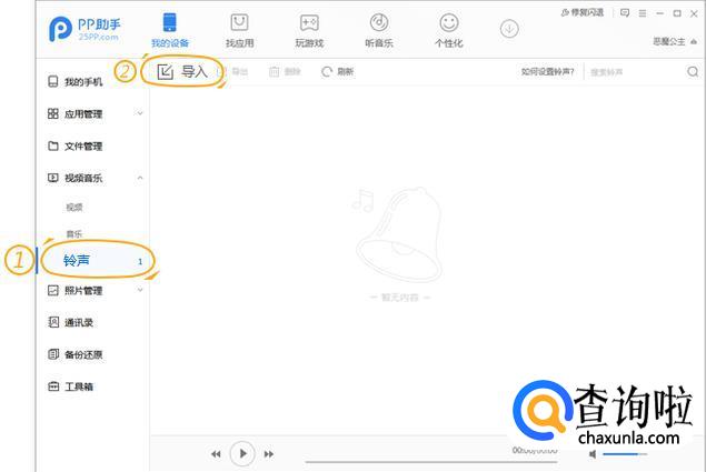下载好之后,点击进入PP苹果助手。来到pp苹果助手界面。点击左边框里的“铃声”。再找到上方的“导入”。