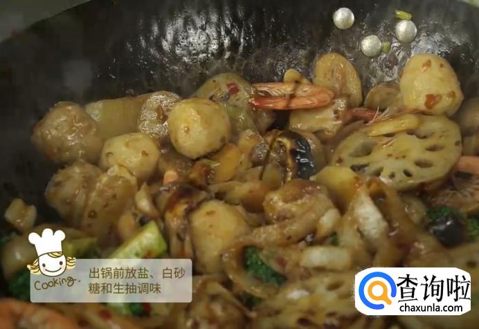出锅前加盐、白砂糖和生抽调味。