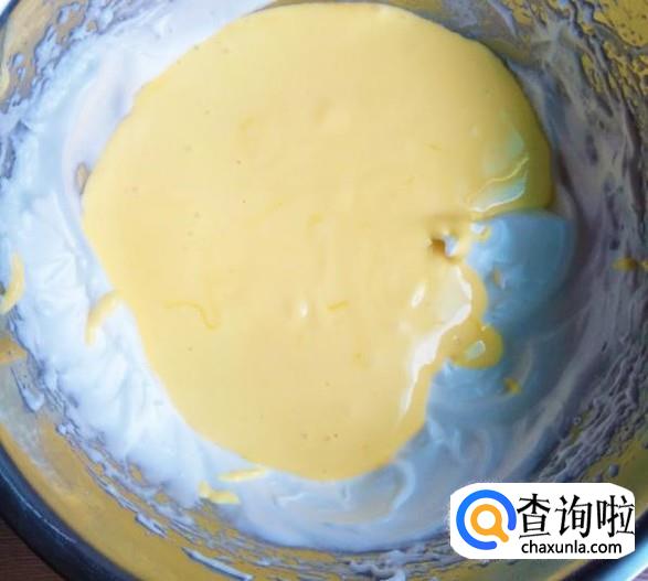 用硅胶刮刀取三分之一蛋白放进蛋黄糊翻拌均匀,不要转圈搅拌以免消泡,从底下像炒菜那样翻拌,不要太重的拌,手法要轻。