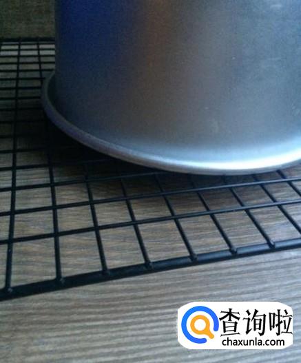蛋糕烤好后戴着隔热手套迅速从烤箱取出蛋糕,垂直摔一下震出热气,然后立即倒扣在晾网上放至凉透,再多啰嗦一句,一定要倒扣凉透再脱模,否则会塌腰,回缩,可在烤网下放两个碗,让热气更好的散发出去。