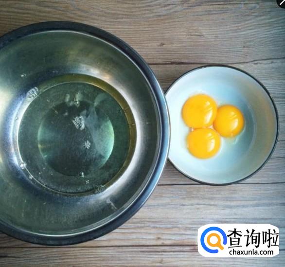 把蛋清与蛋黄分离,鸡蛋连壳总重140克,放蛋清的容器须无油无水无杂质,分离蛋清时要注意不能有一滴蛋黄在里面,否则很难打发。