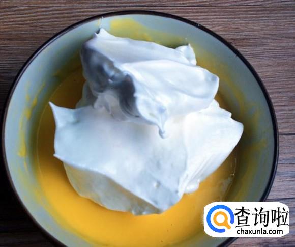 拌好的蛋黄糊全部倒入打发的蛋白中,还是像刚才那样翻拌均匀,动作要快要轻。