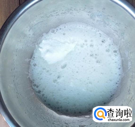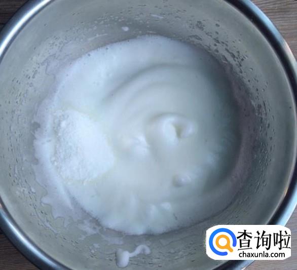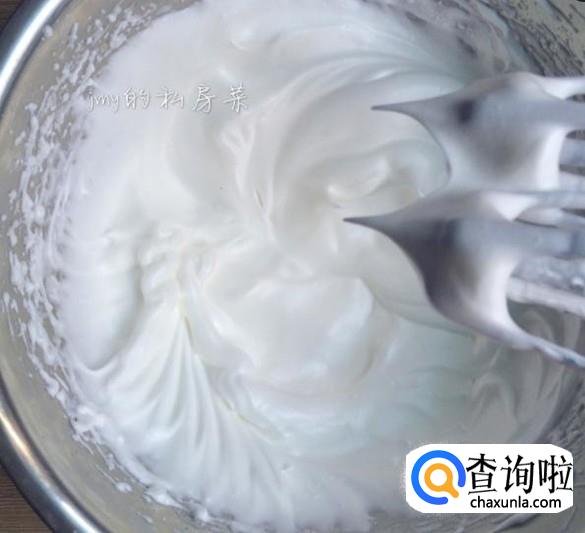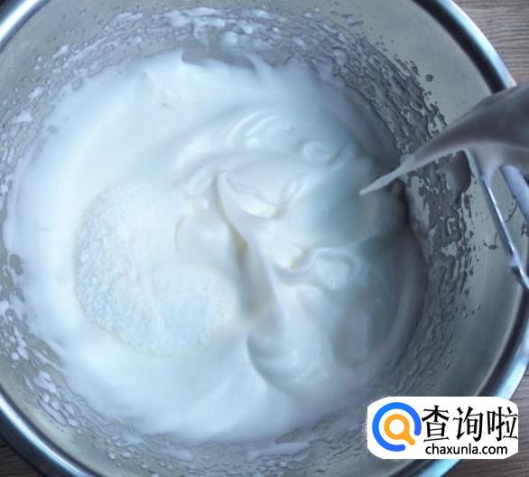用电动打蛋器继续高速打发,当蛋清泡沫消失,细腻顺滑的时候再加入三分之一糖粉。