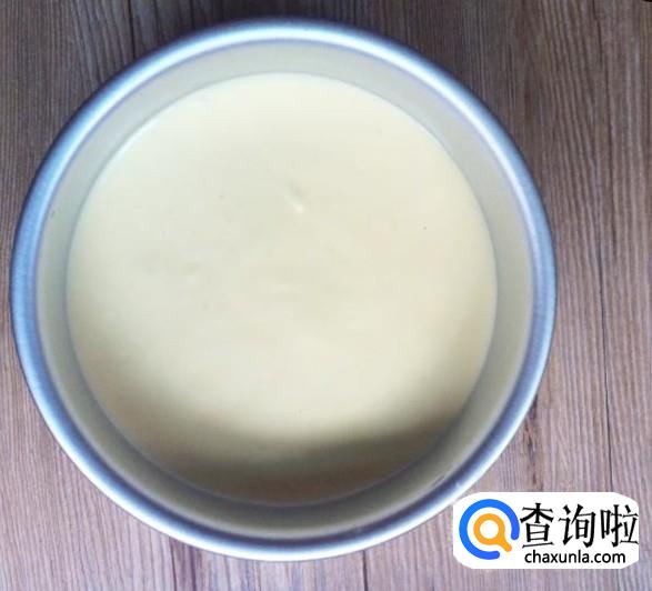 把拌好的面糊倒入六寸阳极活底模中,从高处十厘米左右垂直摔几下震出大汽泡,我摔了大概十几下,哈哈,震平后如果模具边缘有滴落的面糊擦拭干净,否则会影响戚风的爬高。