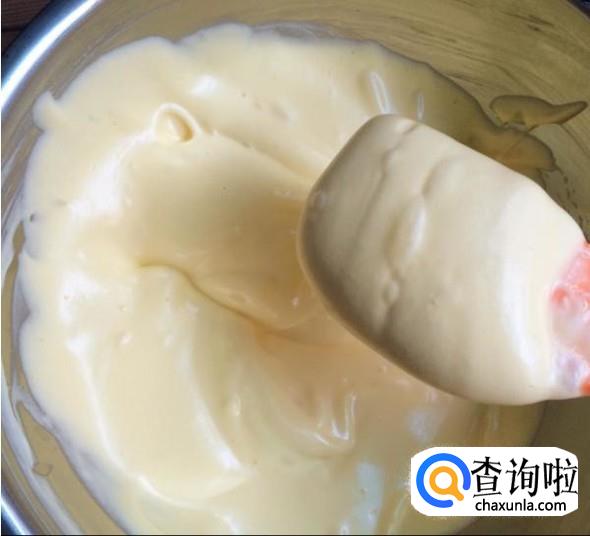 打蛋器从面糊中提起,面糊从打蛋器上轻松顺滑的滴落下去且无干粉,蛋黄糊成功拌好,放一边待用。