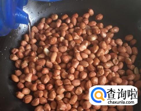 将花生仁控干水分,在锅中放入少量食用油,未等油热,就将花生仁放入锅中,小火快速翻炒。