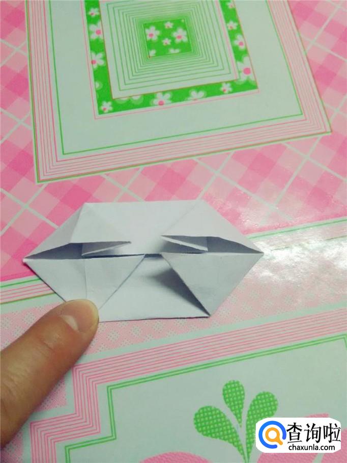 以手指尖的那个角为中心,把四个小角往中间翻开,按平。
