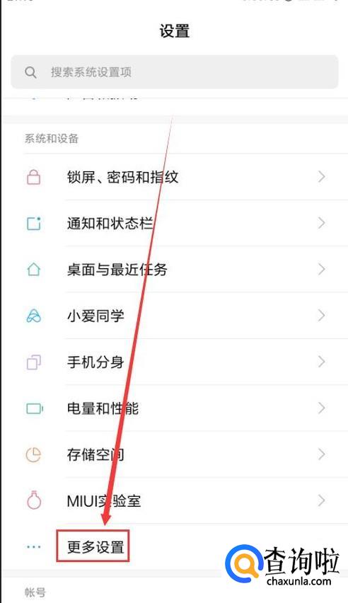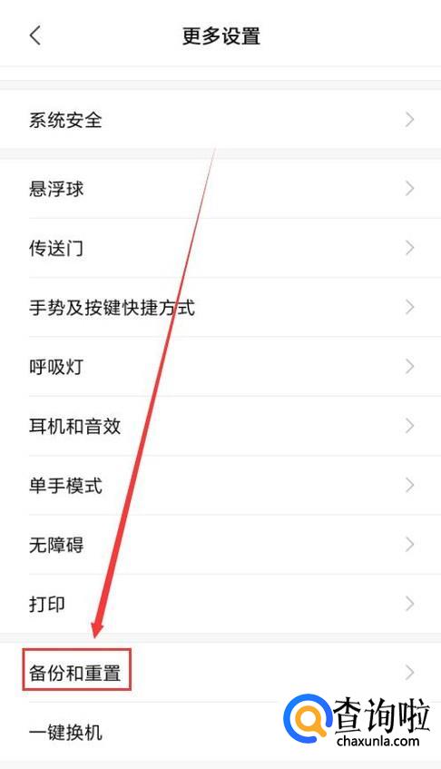 下拉页面,找到“更多设置”,然后在下拉菜单中找到“备份和重置”。
