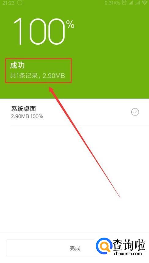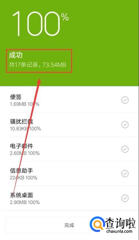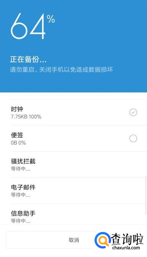 如图,这里只是选择备份了“系统数据”,当百分数到达100%的时候备份就完成了。如果是选择两项数据全部备份的话,花费的时间可能会多一些。